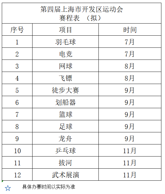 第四届上海市开发区运动会以向新、向心、向兴为口号拟设置12个单项比赛,分别为足球赛(七人制)、篮球赛(五人制)、羽毛球赛、乒乓球赛、网球赛、飞镖赛、路跑-徒步大赛、武术、拔河赛、划船器赛、龙舟赛、电竞赛(王者荣耀)。各单项赛事将陆续在7—11月举行。同时,各开发区或有资质的公司可向组委会申请以冠名单项赛事活动、联合承办、场地支持等形式参与,组委会将根据条件、项目情况,予以确定。